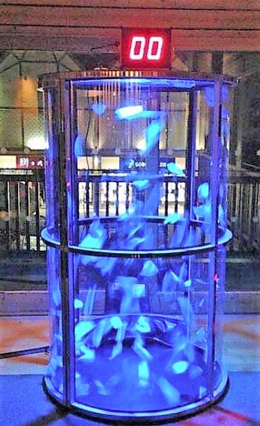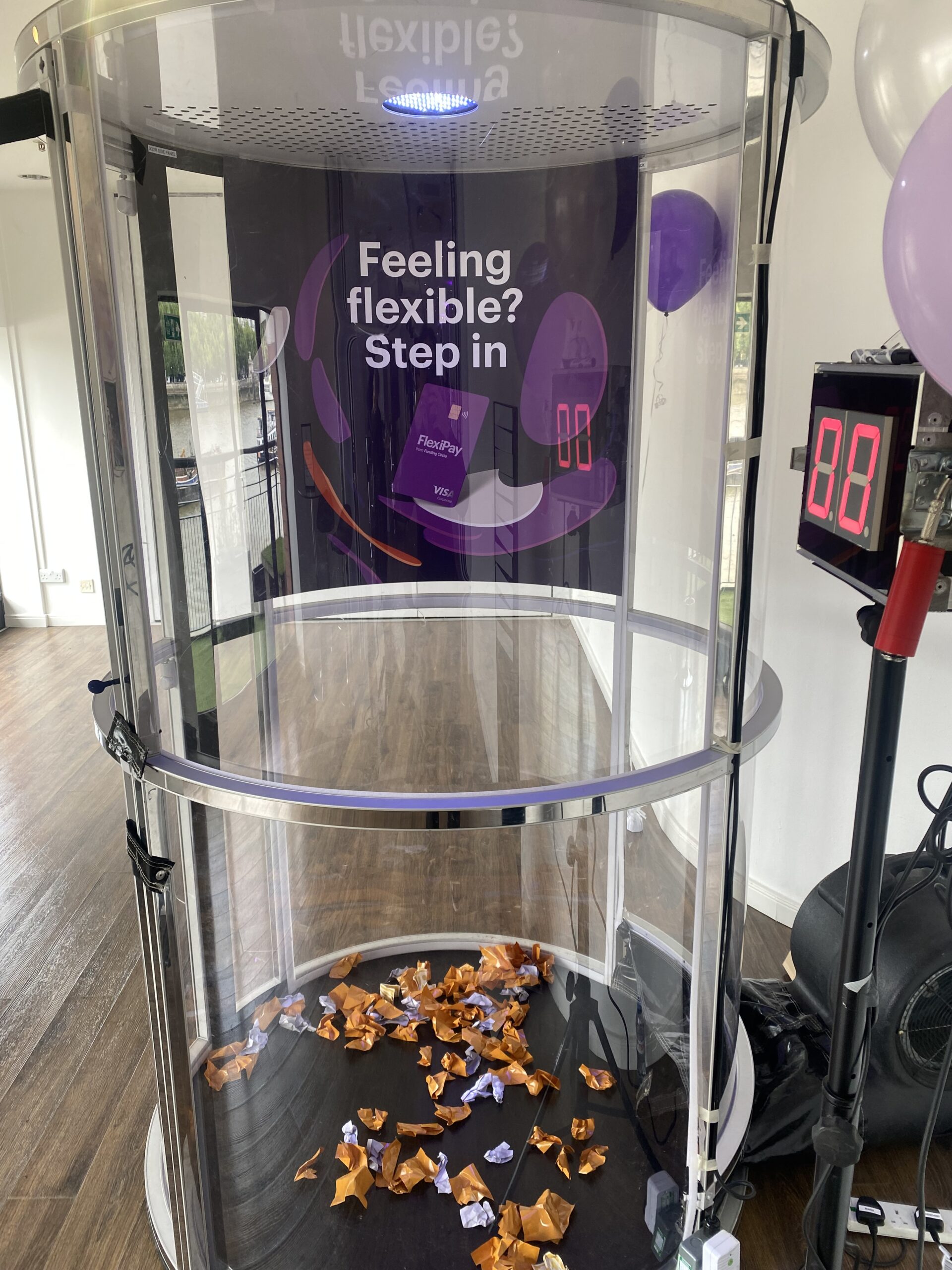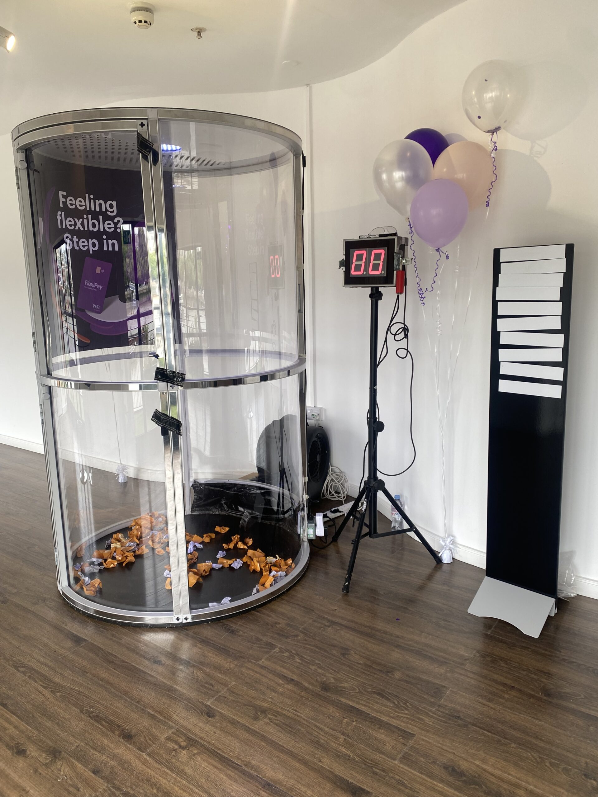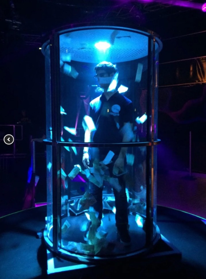 Each player gets 60 seconds inside the machine to grab as much flying “cash” (or tokens, vouchers, or custom-branded prize slips) as possible while a digital countdown ticks away.